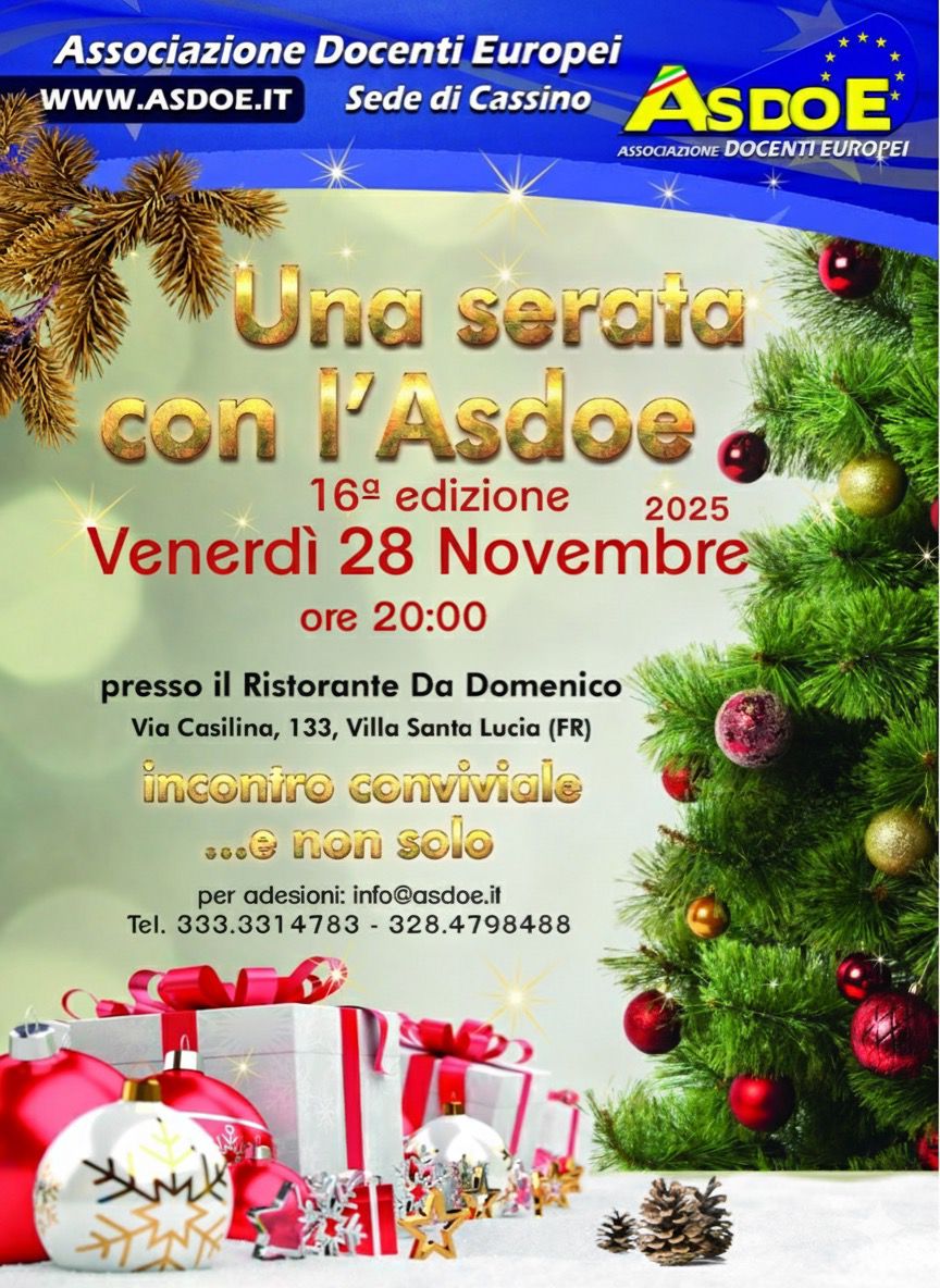 L'Associazione Docenti Europei invita tutti i soci e simpatizzanti alla riunione conviviale il prossimo 17 dicembre 2022 presso il ristorante "Da Domenico" a Villa Santa Lucia.